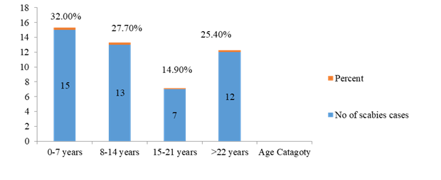 Therefore, the results are still helpful in the context of the study. Our study indicates that there is a significant burden of scabies disease in children between the ages of 0 and 7 years. The finding may be truly expressed; this age group does not maintain good hygiene, and mostly spends their time playing with mud/soil. Nearly half of the scabies cases were reported among students; it may be true that students have had contact with scabies-infested persons, and schools are also a source of scabies infestation. Although the sample size was not calculated precisely, keeping in mind the disease frequency, cases that fulfilled the inclusion criteria during the study period in purposely selected kebeles were included.
