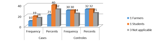 Among the total cases, about 19 (40.3%) were Muslims, and 28 (59.7%) were Protestants. 32(34%) were Muslims, 58(61%) were Protestants, and 10 (5%) were Orthodox religion followers for controls. Of the respondents, about 10(21%) cases and 30(32%) controls were farmers (Figure 3).