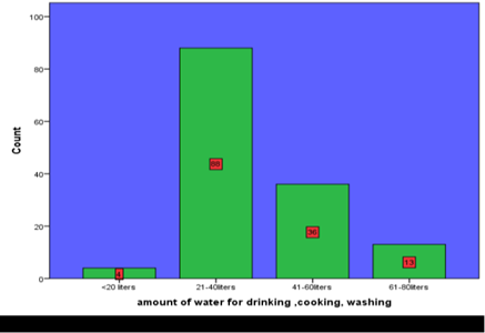 Among the 141 respondents, about three-fourths got 21-40 liters of water for drinking, cooking, and washing per day, while only 13 respondents got 61-80 liters of water per day (Figure 4).